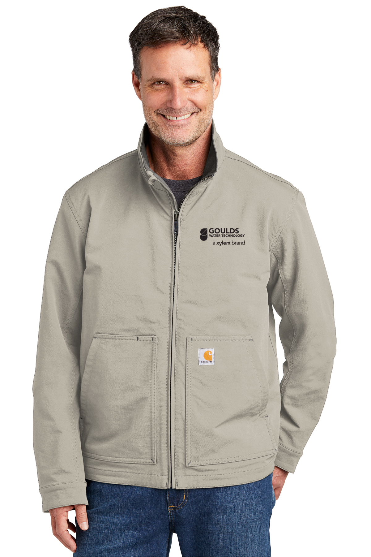 8.1-ounce, 97/3 nylon/elastane 100% polyester stretch taffeta lining Rain Defender® durable water repellent Wind Fighter® technology tames wind Rugged Flex® technology for ease of movement Reverse coil center front zipper with kissing welt Zip-through cadet collar Secure interior pockets Two lower front pockets Adjustable cuffs Drop tail hem for added coverage Carhartt-strong, triple-stitched main seams Carhartt label sewn on left pocket